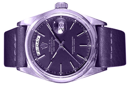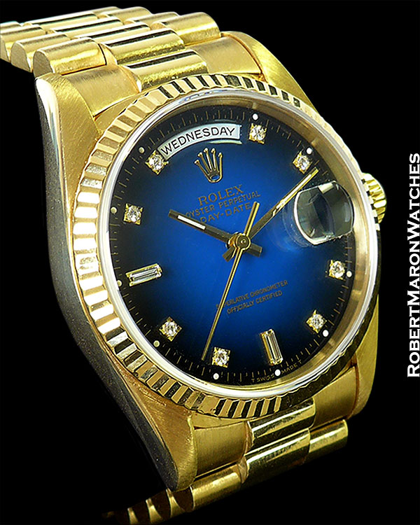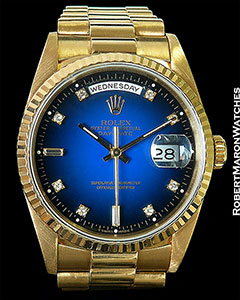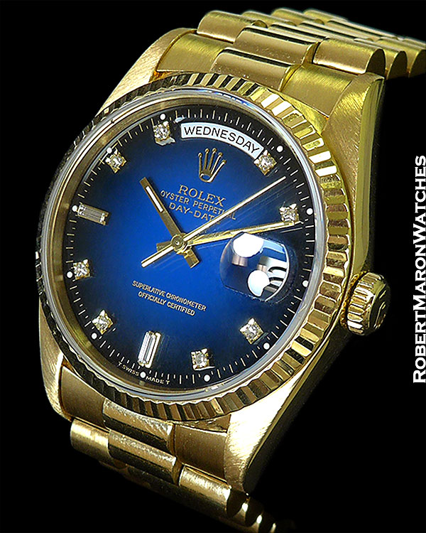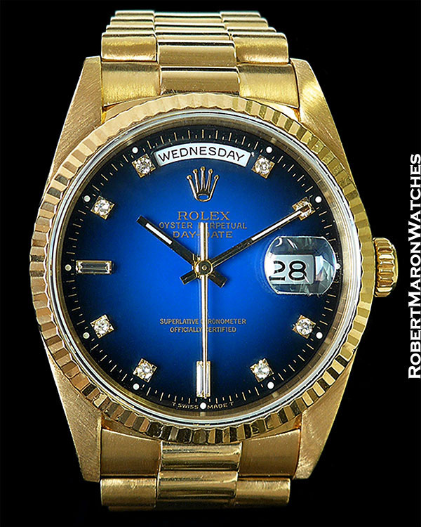 Around here, we never tire of the Rolex Day Date, also known as “The President”. Rolex regards the Day Date as its top of the line watch. A solid 18k gold watch on a solid 18k bracelet makes a statement, and so does the fact that Rolex only offers The President in precious metals. The blue vignette dial on this watch is sublime. Rolex saves its rarest and most interesting dials for the Day Date.