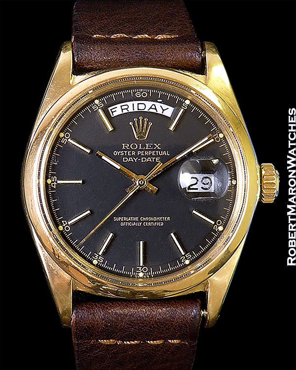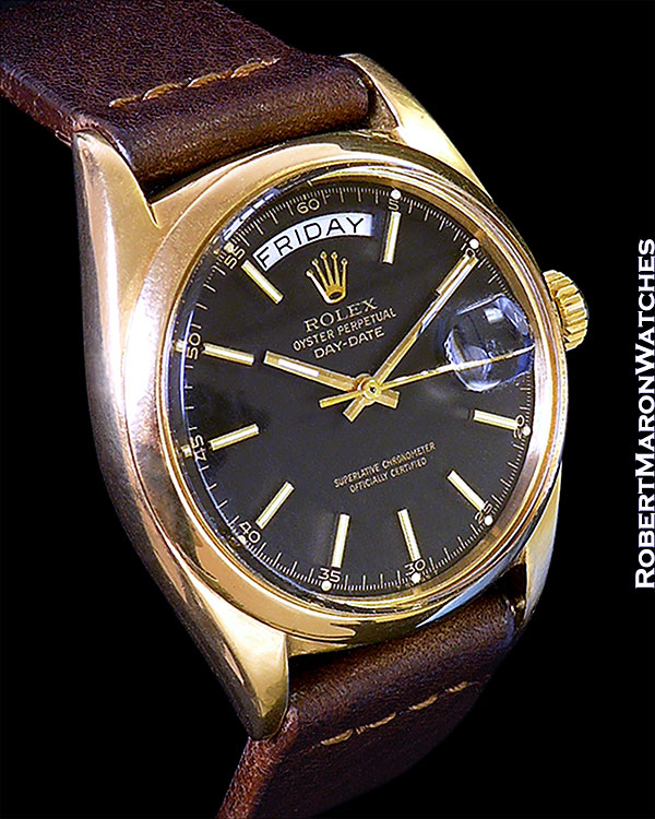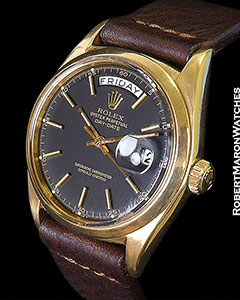 Original untouched perfect condition rare matte black pie-pan dial with gilt printing and applied hour markers and intact adjacent original luminous dots. Hands are Rolex service hands. Full day is on display along with the date.